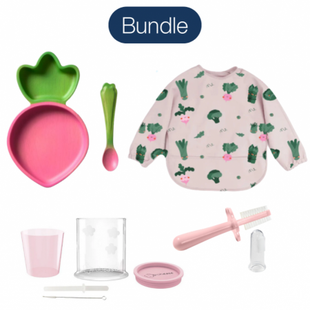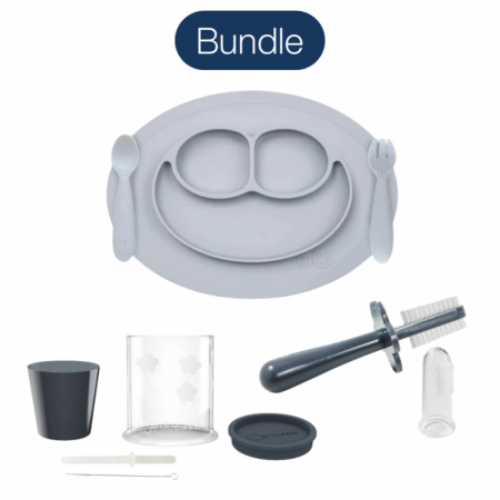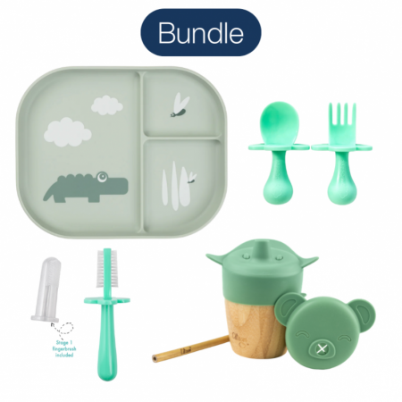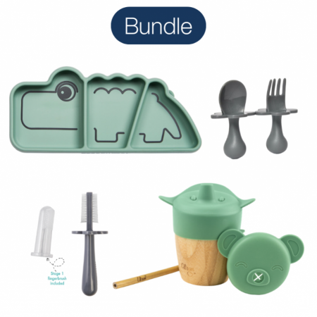 A thoughtfully paired bundle of a double-sided toothbrush and utensils, designed for tiny hands. It helps baby explores self-feeding while building healthy habits of brushing their teeth.