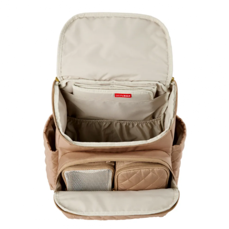 Our lightweight, quilted backpack offers hands-free convenience and special packing cubes for baby's essentials. The spacious interior has room to tote everything from snacks to spare outfits and the extra wide opening makes it easy to find essentials in a pinch. The front compartment includes 2 multi-purpose packing cubes and allows for extra storage. Everything stays in reach with elasticized interior pockets and insulated side bottle pockets. The changing pad pocket performs double-duty, acting as a laptop holder when traveling. With the Forma backpack, function meets fashion to take you from birth to toddlerhood and beyond in style.